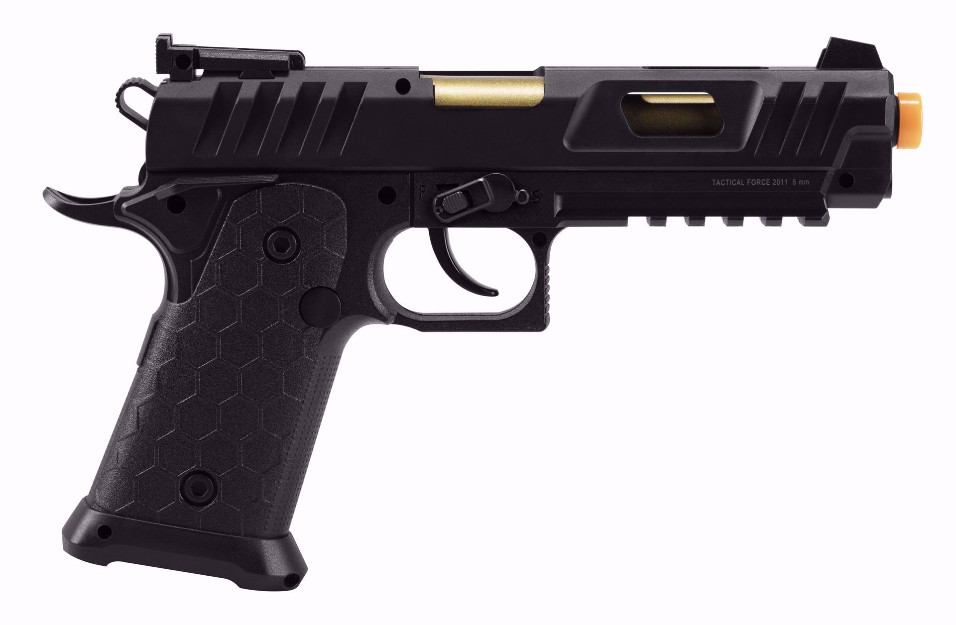 Double the fun with the new Tactical Force 2011 6mm airsoft pistol. In the firearms world, the 2011 is double-stack 1911 style pistol with a modern design twist as the manufacturer sees fit. With the TF 2011, we give you the big grip feel of the 2011 design with an agressively cut slide with dual-cut-away windows, under-barrel Picatinny rail, and high-set sights. The TF 2011 launches .12 gram airsoft BBs at 400 FPS and the stick magazine holds 14 BBs. Pick up a bottle of Elite Force Airsoft BBs, plenty 12 gram Umarex CO2, and some spare magazines for weekend after weekend of airsoft!