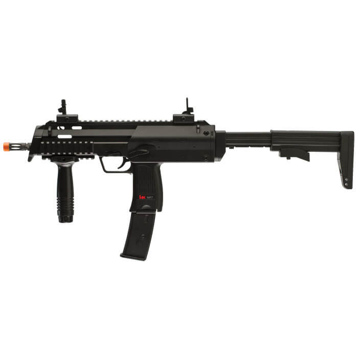 The MP7 AEG airsoft rifle is an electric gun that shoots BBs at 240 FPS. With a 180-round capacity and a built-in hop-up BB system you can shoot for long periods of time without reloading. The Flip-up sights are a great accessory as well as the integrated accessory rail and detachable grip!
