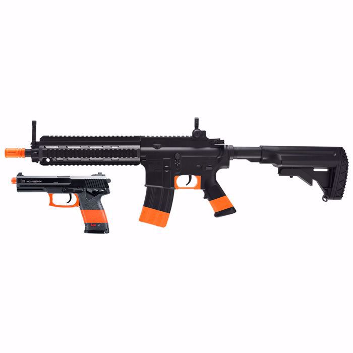 Get operational! The HK 416/MK23 combination is ready to get you operational on the airsoft field. This AEG/Spring powered two-pack provides a primary and secondary airsoft guns for great fun on the field. The rifle is modeled after the HK 416 that the US Delta Force made famous in combat and the MK23 is likewise famous as a result of its USSOCOM pedigree.
